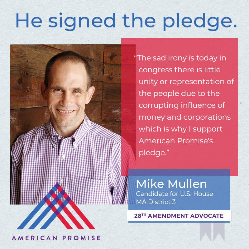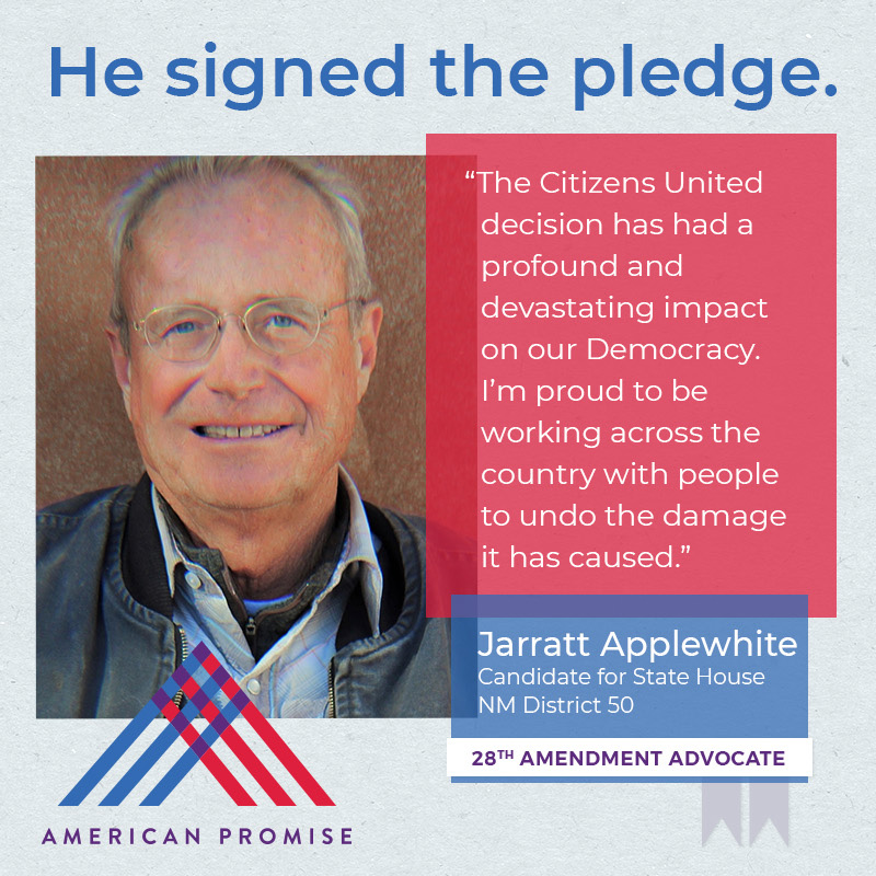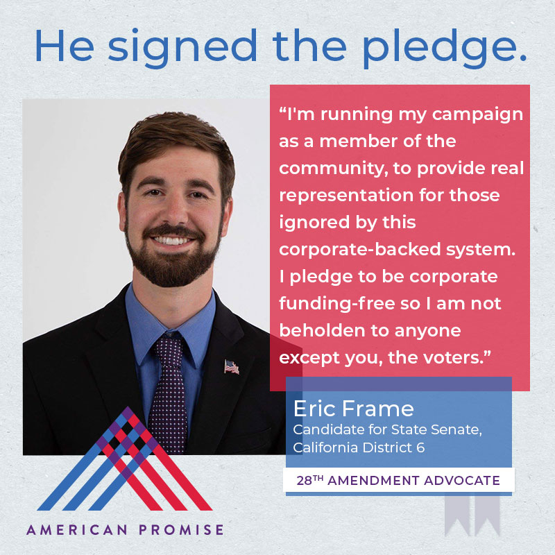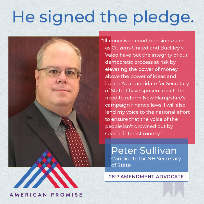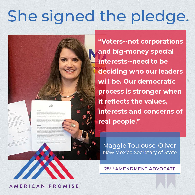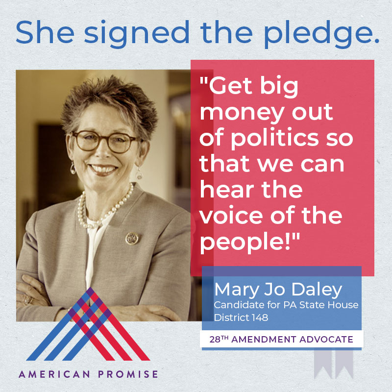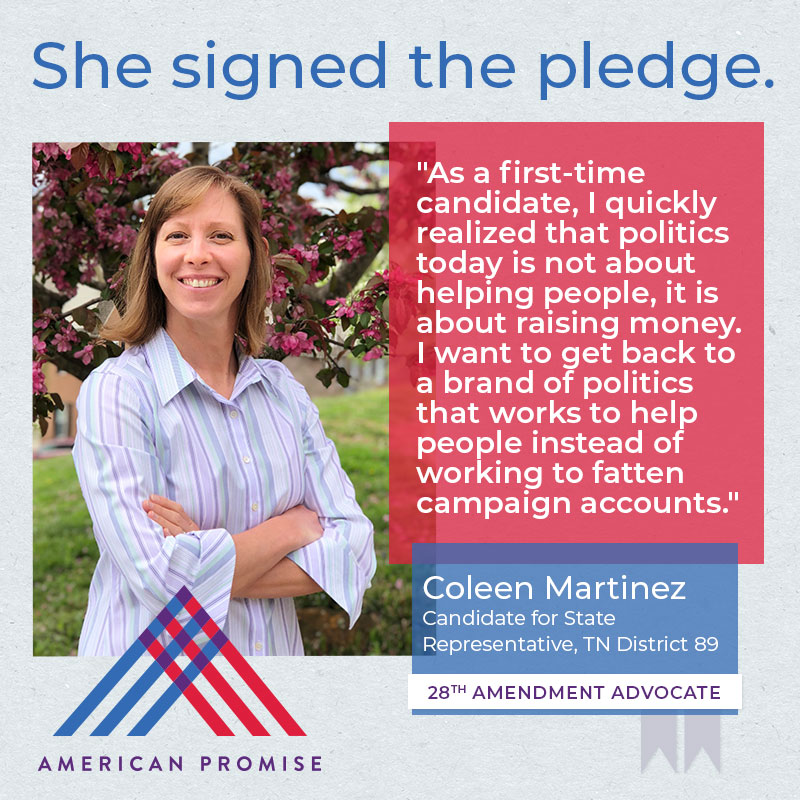 The American Promise Candidate Pledge is a volunteer-led effort to get candidates and elected officials at all levels of government to pledge on the record that they will use their office to advance the 28th Amendment.
