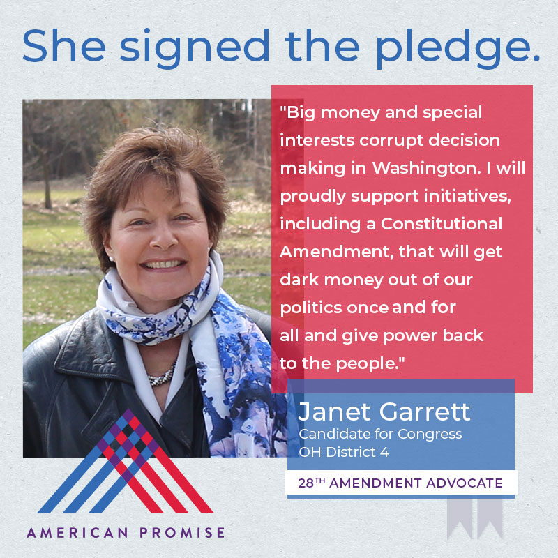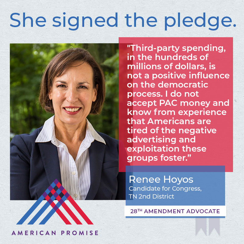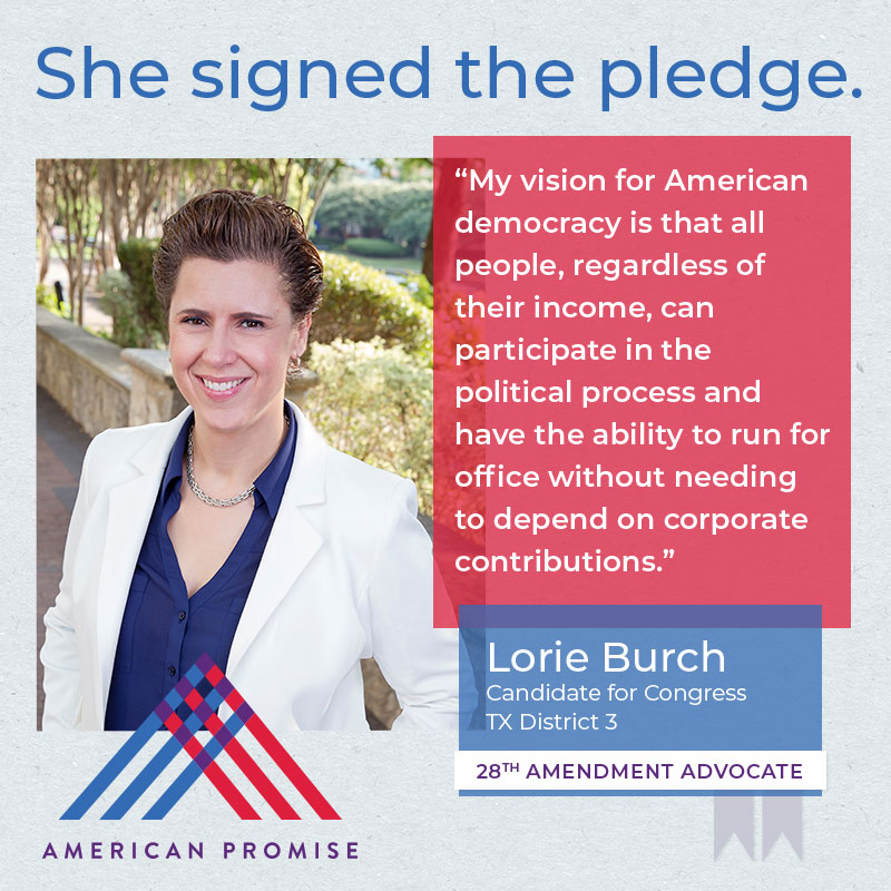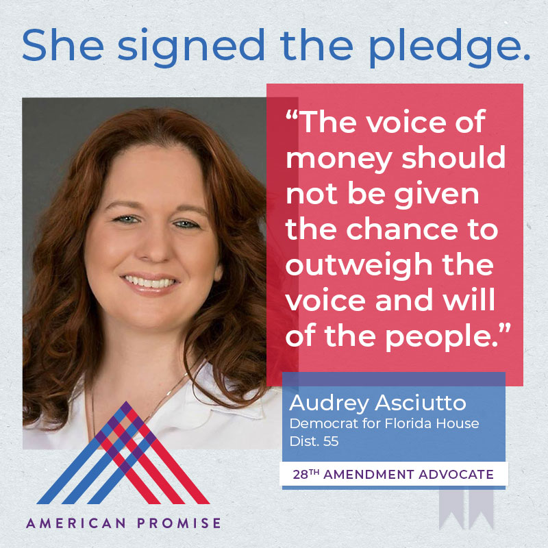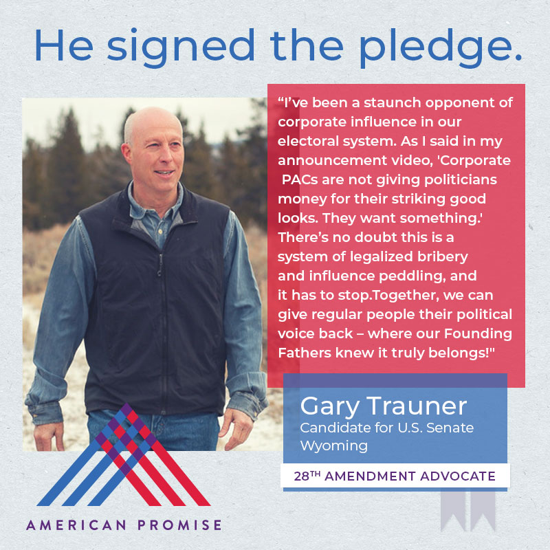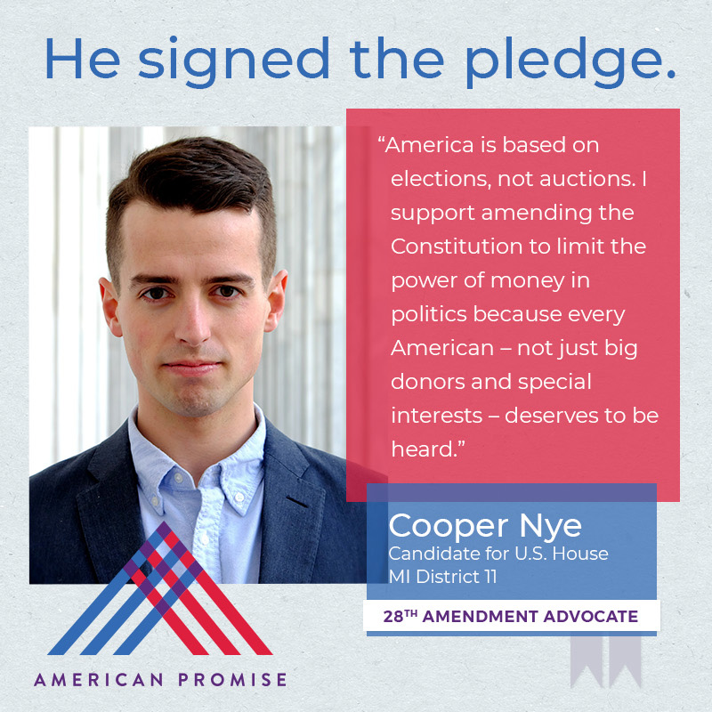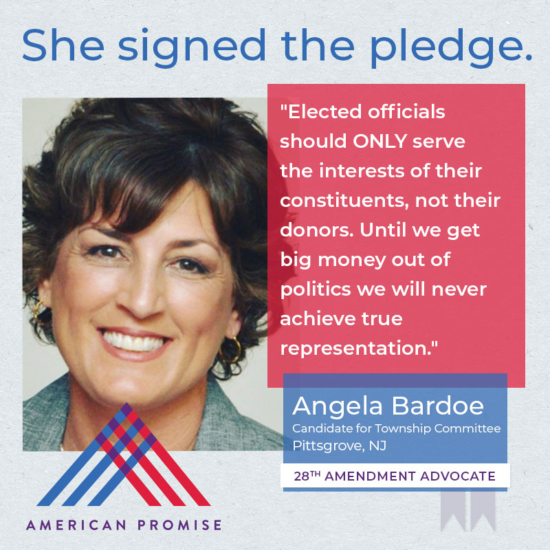 The American Promise Candidate Pledge is a volunteer-led effort to get candidates and elected officials at all levels of government to pledge on the record that they will use their office to advance the 28th Amendment.
